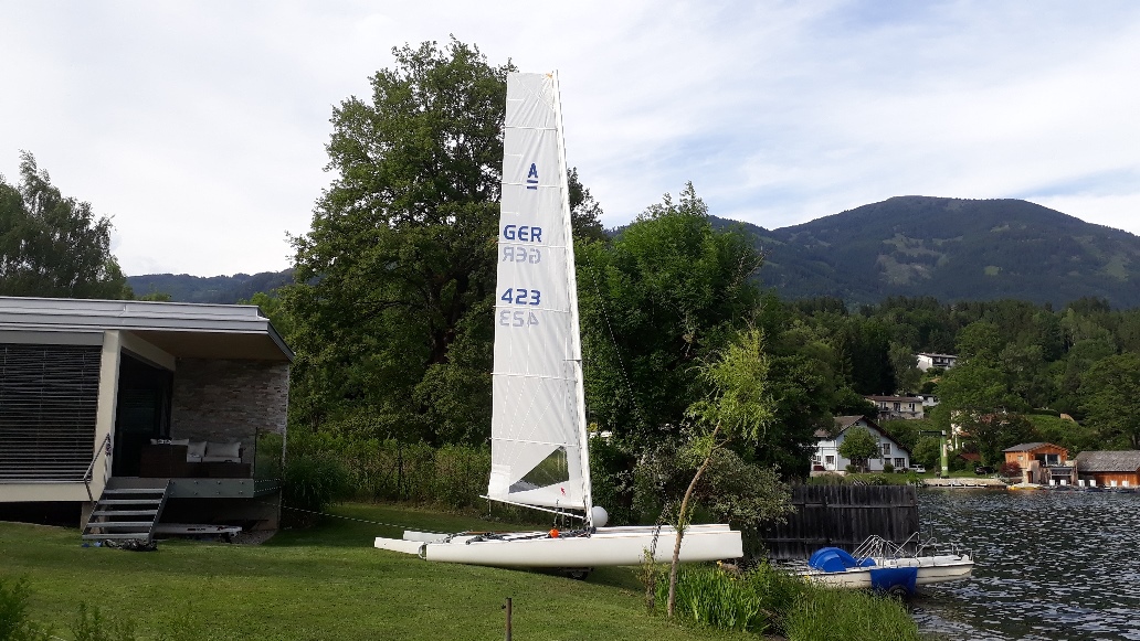ideal für Anfänger, schnelles und einfaches Boot, BJ 95, Carbon Rümpfe, Beam und Mast Alu, guter Gesamtzustand, neues CBS-Segel nur ca. 10 mal gesegelt, inkl. Harbeck Anhänger mit Alukiste und Slipwagen, Vollpersennung, Liegeplatz Millstättersee, Eur: 3.000,- email: