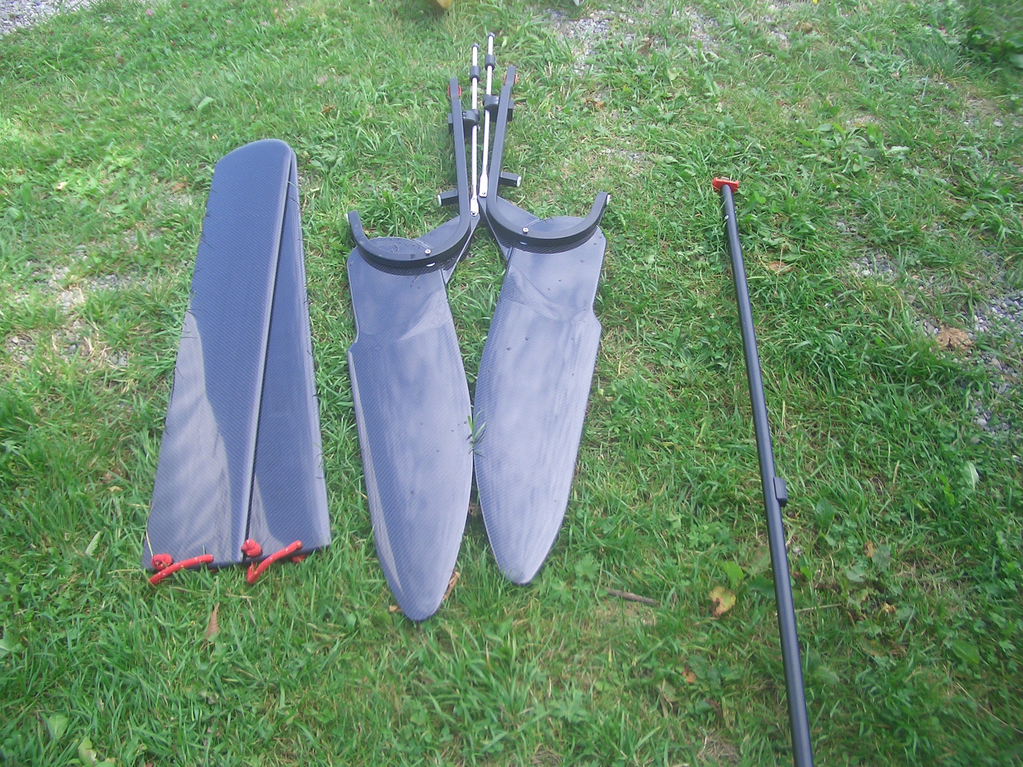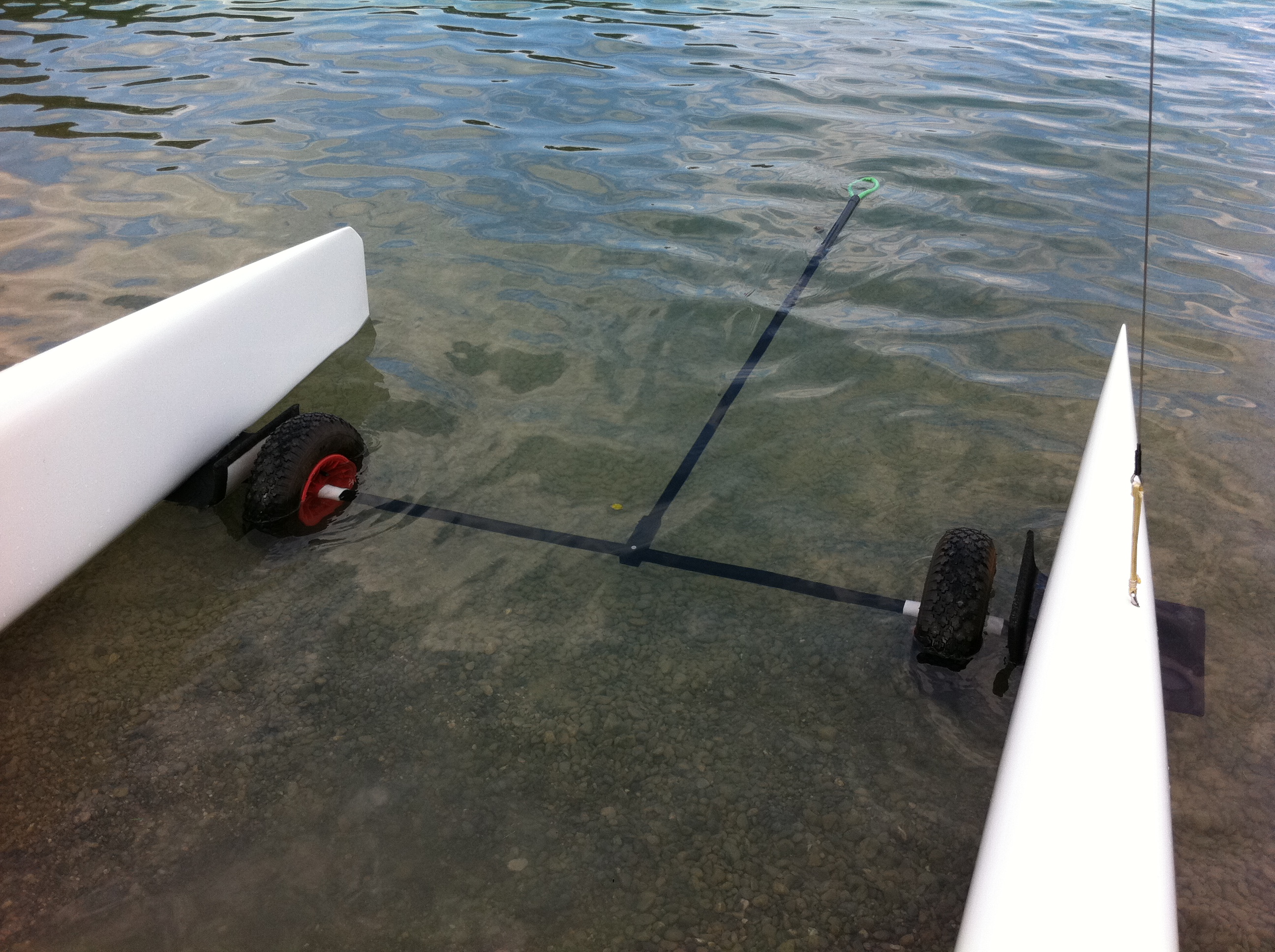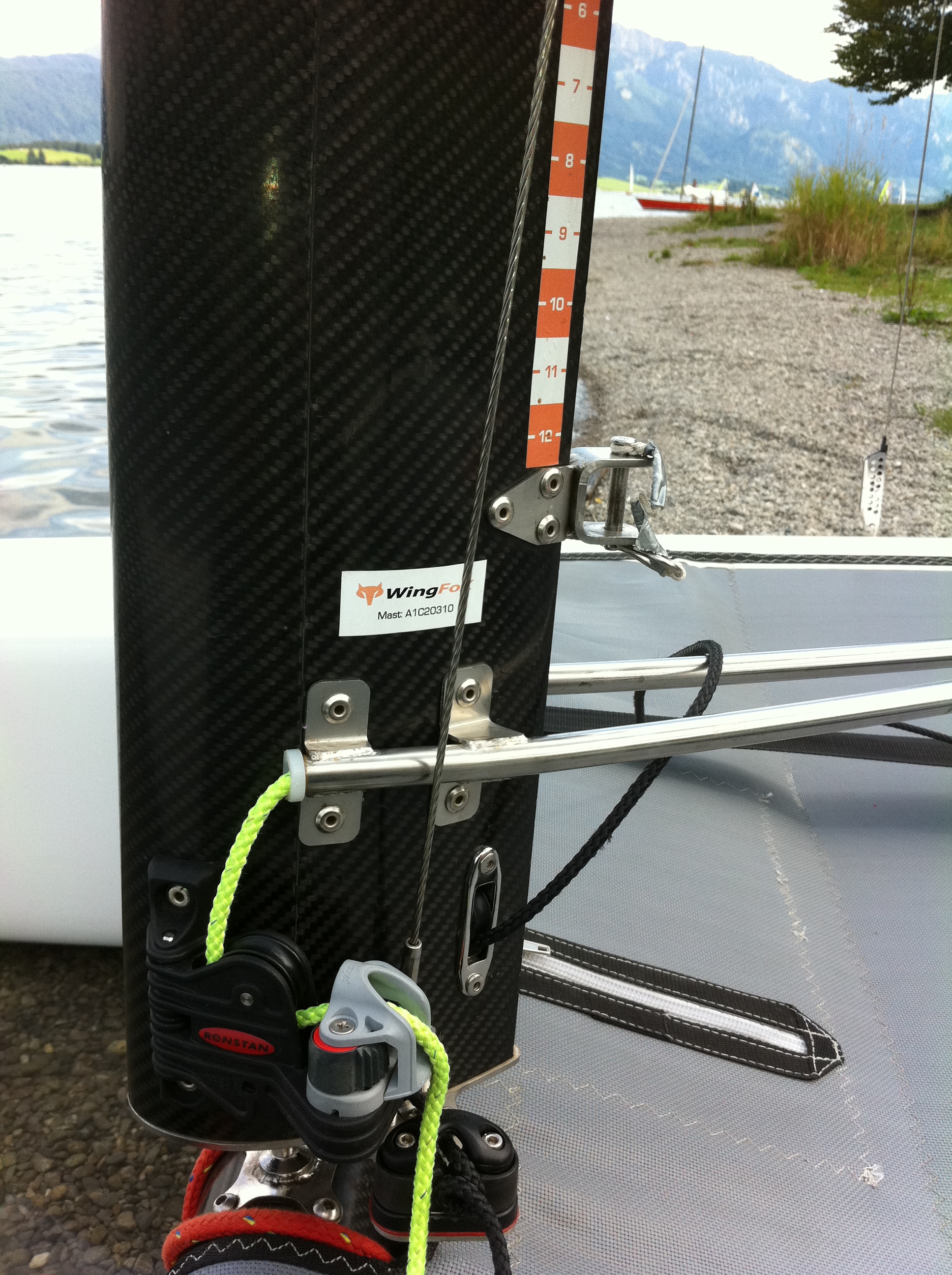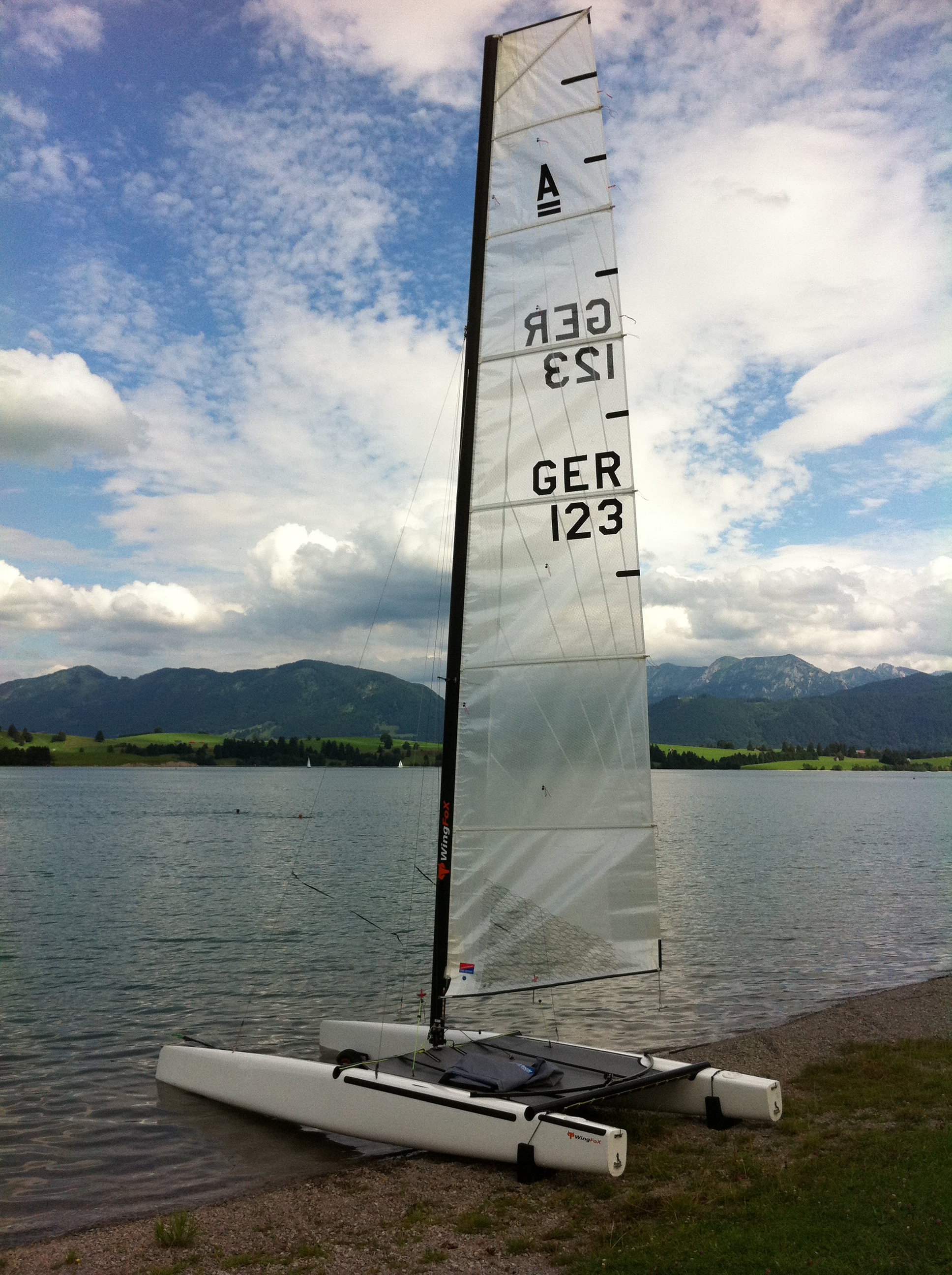 Er ist Bj. 2010 und vollständig aus Carbon, auch Mast, Baum, Schwerter, Ruderblätter und Pinne.