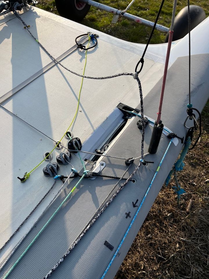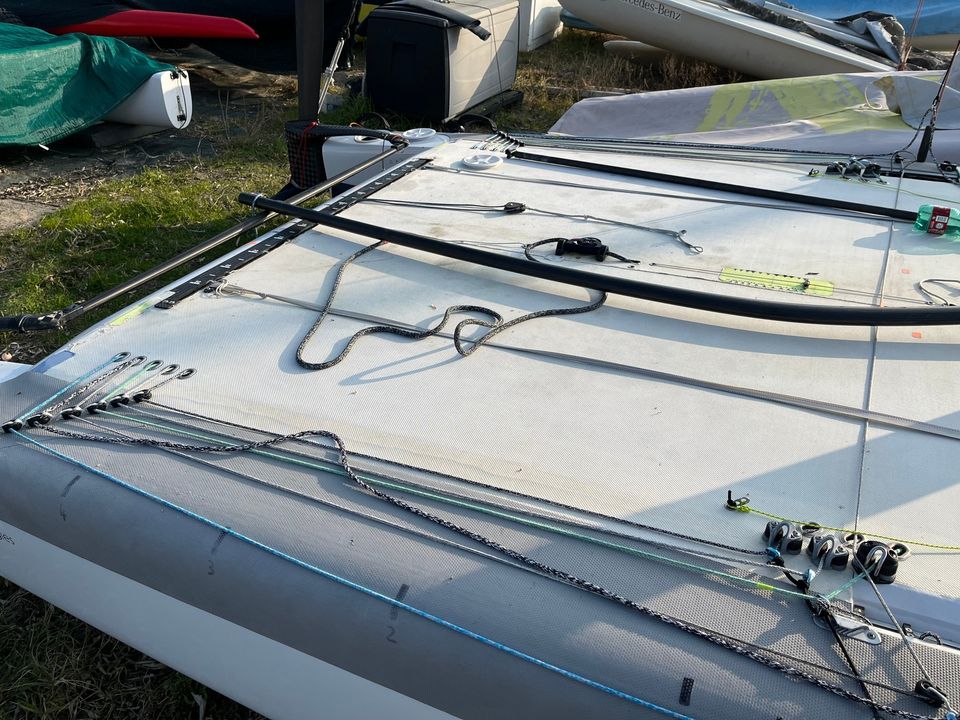 Z27 daggerboards, 2020 rudder winglets, rudder rake and offset, white trampoline, traveller cleat updated to new models, 2 spare rudders