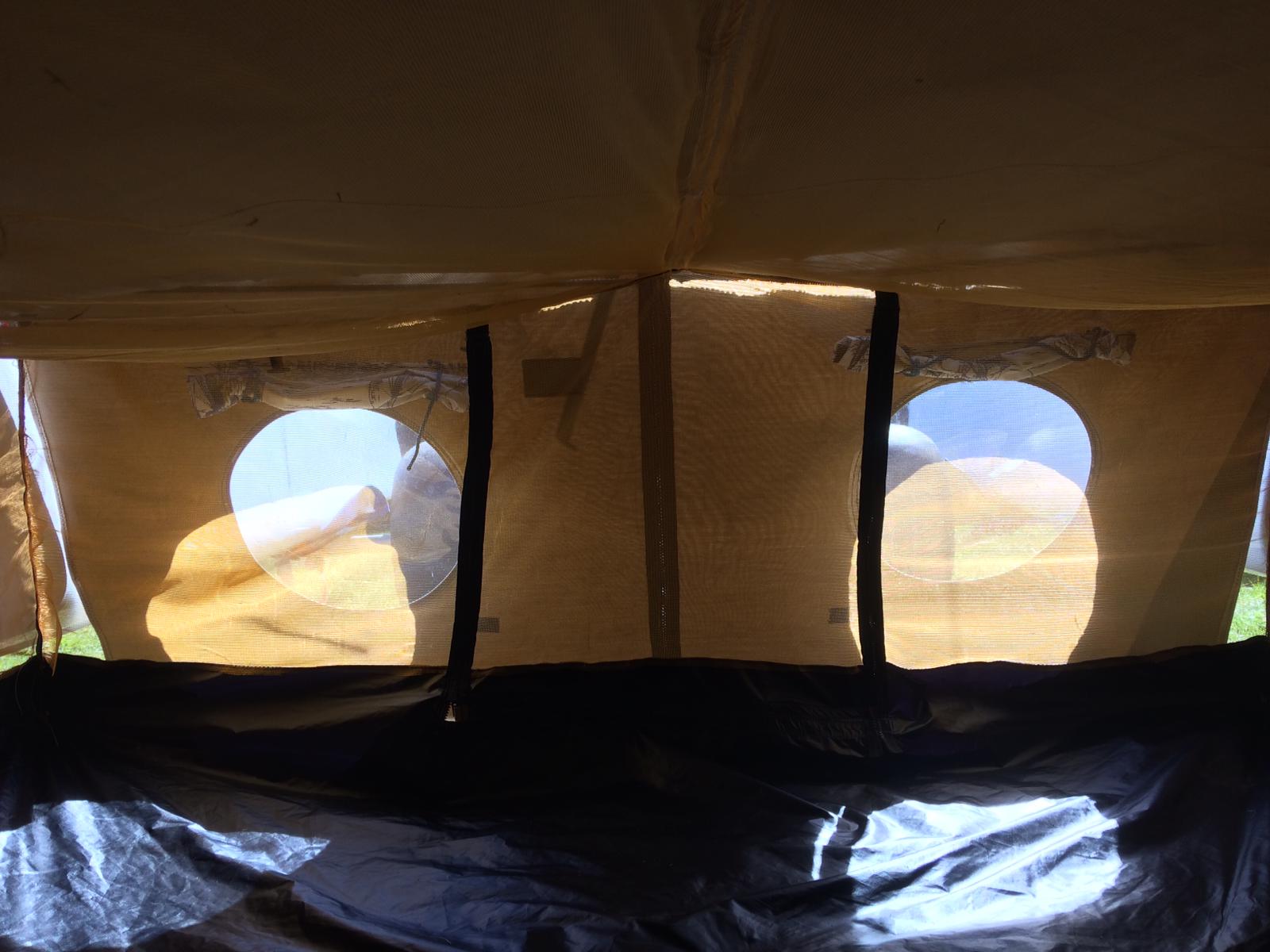 Es besteht aus einem außen und Innenzelt, mit wasserdichtem Zeltboden, Fliegengitter Eingang mit RV, Bullaug-Fenstern (inkl Vorhängen mit Segelschiffen drauf) usw.