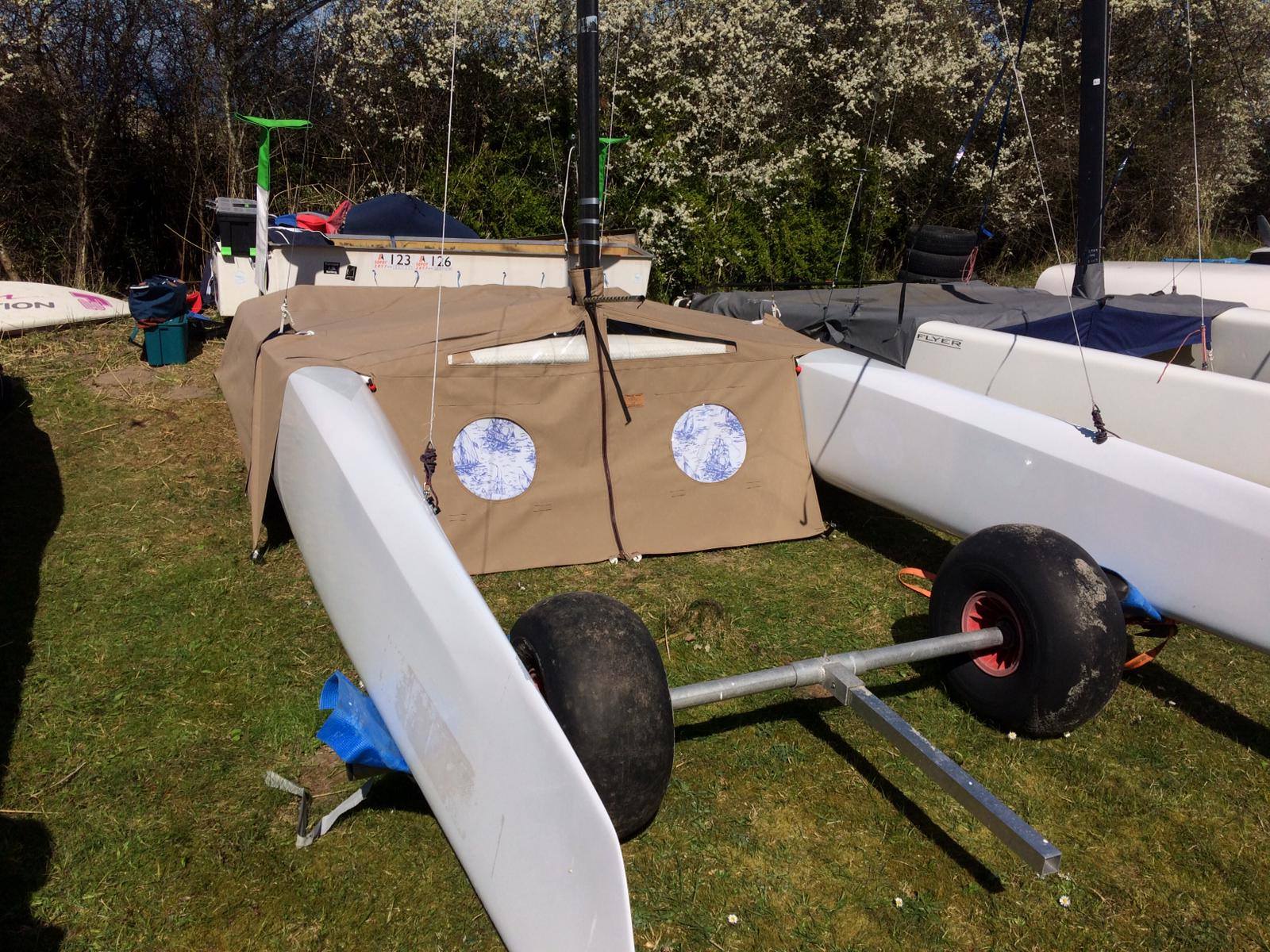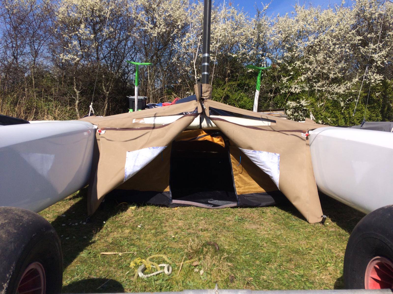 Als Gag für Regatten und Segelwochenenden hatte ich mir mal ein richtiges Persenning-Zelt genäht um unter dem A-Cat zu nächtigen, wenn das Auto zu klein oder mit Foils, Segeln usw. vollgerümpelt ist.