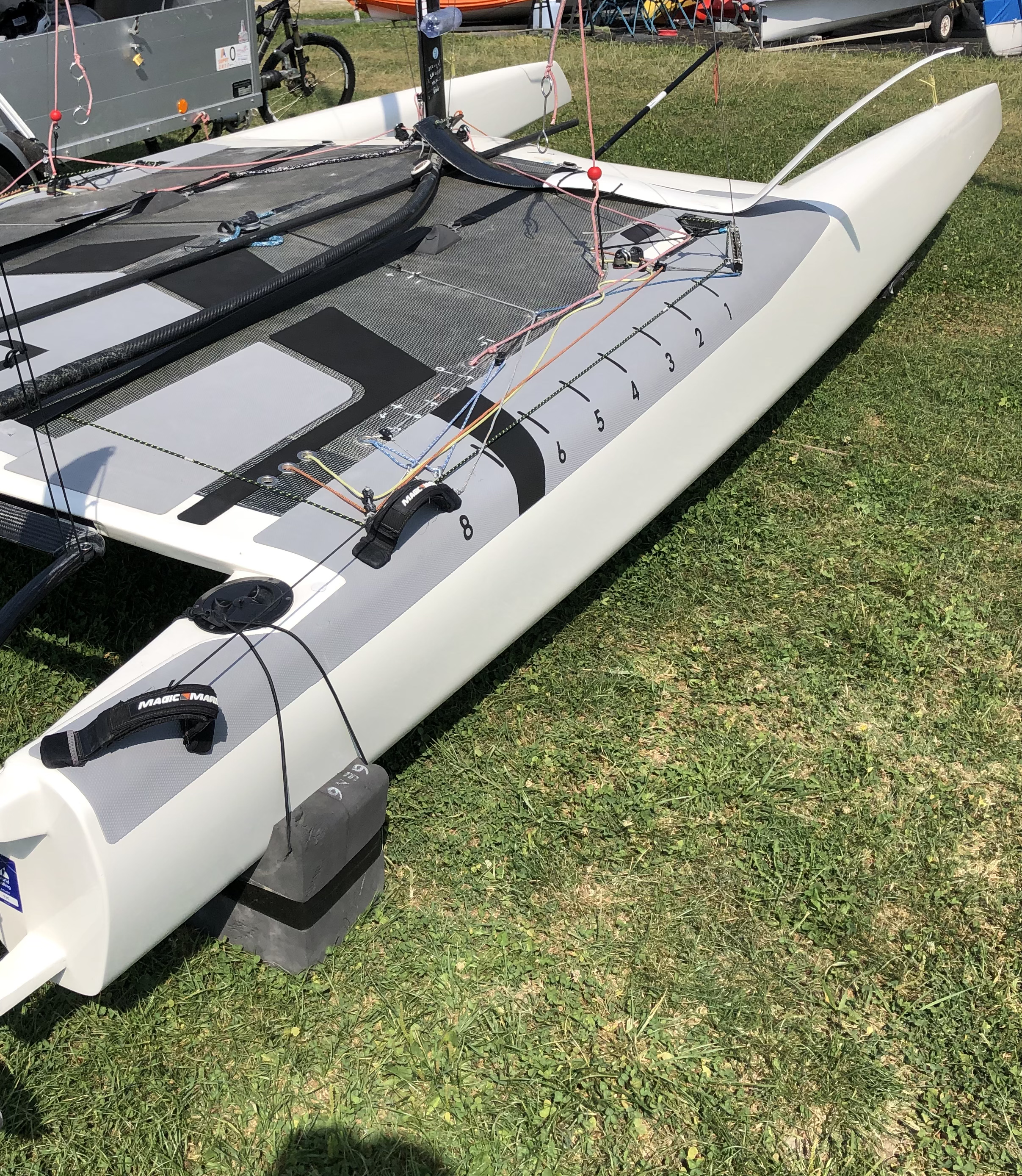 Two sets of main boards, spare rudder, tramp cover, delivered with clear coat only it was painted in winter 20/21, professionell reparation of a hole in the right hull, location lake Ammer (BY) or lake Garda