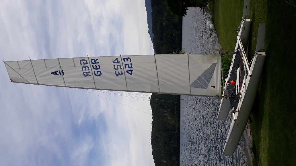 schnelles und einfaches Boot, nur im Süßwasser gesegelt, BJ 95, Carbon Rümpfe, Beam und Mast Alu, guter Gesamtzustand, neues CBS-Segel nur ca. 10 mal gesegelt, Boot mit slipwagen: € 1.100,-, einen Harbeck Anhänger mit Alukiste hätte ich für 800,- dazu, email: berger9800@gmail.com