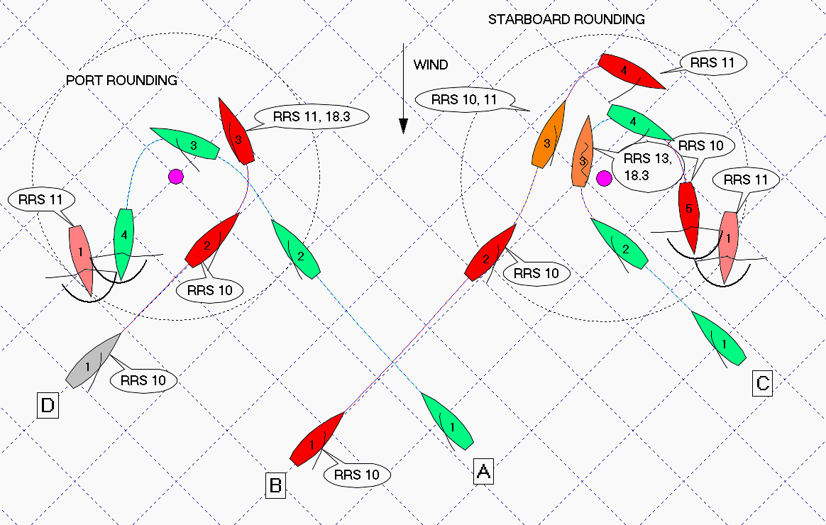 Path C: Also not bad from a rules point of view, but with a nasty twist during the rounding. On starboard you are right of way boat and if you time it right, the port/windward boat has to keep clear. But, if you go trough head-to-wind, before port has to react, your are not keeping clear under rule 13. If port manages to get an inside overlap before you are back on close hauled course, you have to give him room and keep clear as windward boat. If you manage to keep port to windward and keep clear during the tack, you again become right of way leeward boat. Your only limitation is rule 16.1, giving port/windward room to keep clear while you bear away. You best bet is to slow down in position 2, or luff head-to-wind and wait for port to tack before you do. After the rounding, you have to keep clear of the starboard boats approaching on the lay line, whether you gybe or not.