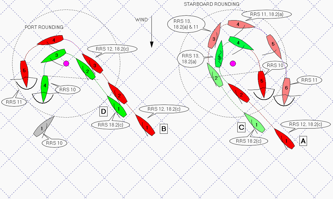 At the other side, at the right hand mark, the clear ahead boat faces a dilemma. As soon as she passes head to wind, rule 18.2(c) switches off and stays off. If the clear astern boat is close enough, the boat passing head to wind has to keep clear under rule 13 (tacking) and on top of that, if the boat from clear astern manages to create an inside overlap, she has to keep clear after tacking as well.