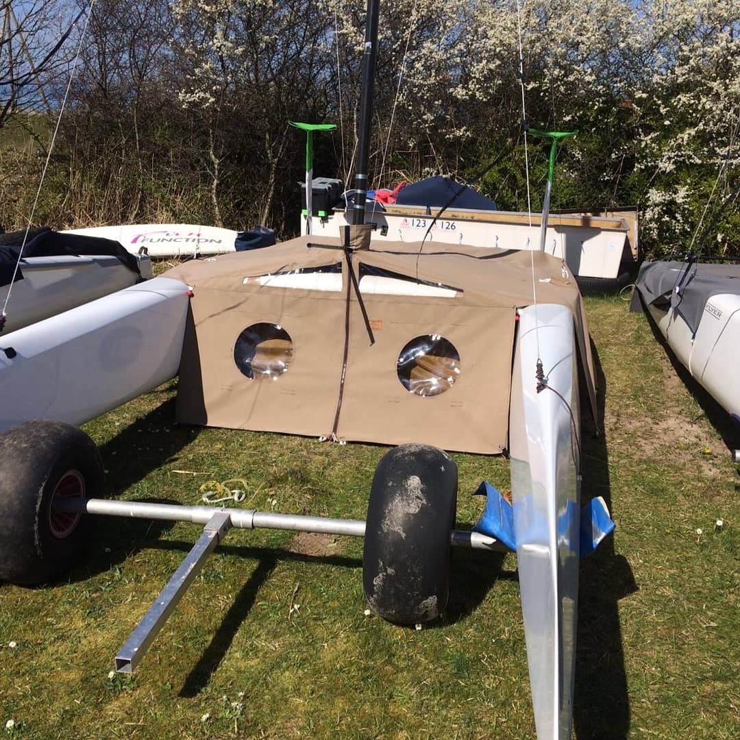 Als Gag für Regatten und Segelwochenenden hatte ich mir mal ein richtiges Persenning-Zelt genäht um unter dem A-Cat zu nächtigen, wenn das Auto zu klein oder mit Foils, Segeln usw. vollgerümpelt ist.